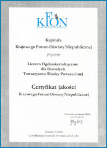 Z dumą informujemy, że nasze Liceum Ogólnokształcące dla Dorosłych TWP otrzymało Certyfikat Krajowego Forum Oświaty Niepublicznej – KFON